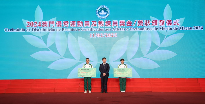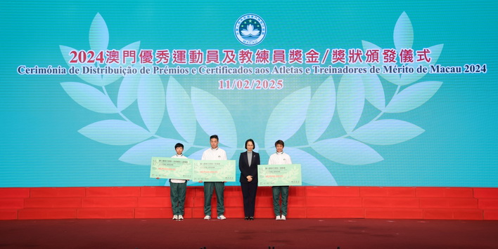 【本報消息】為表彰在2024年度參加體育比賽中獲得優秀成績的運動員、教練員及技術輔助人員,「2024澳門優秀運動員及教練員獎金/獎狀頒發儀式」於11日晚上舉行,社會文化司司長柯嵐等出席了頒發儀式,並祝賀獲獎的隊伍。