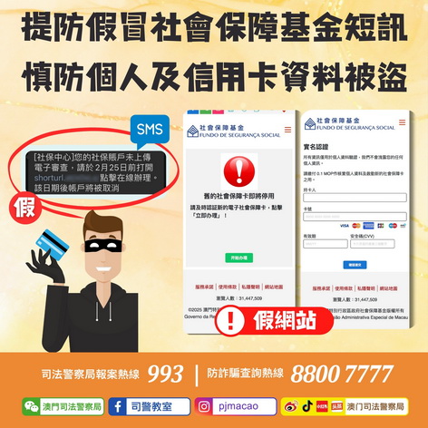 【本報消息】司法警察局接獲社會保障基金檢舉,指有人冒充社會保障基金發出釣魚短訊,內容聲稱「社保帳戶」未上傳電子審查,要求市民點擊短訊內附帶的連結,否則將註銷帳戶。