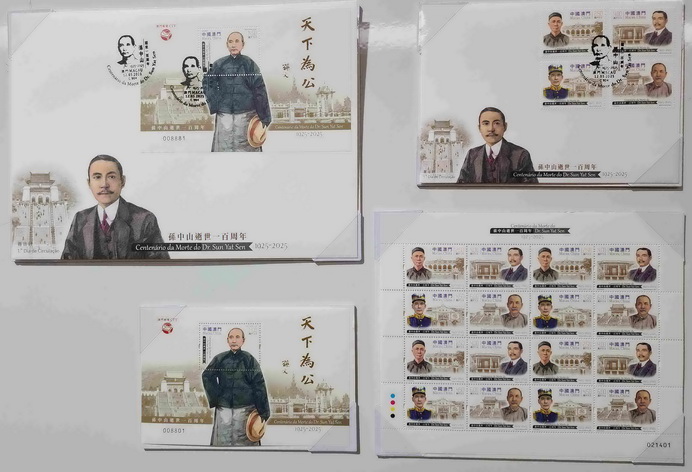 今年是孫中山逝世100周年,是次發行的一套四枚郵票票值分別為2.5元、4元4.5元和6元,設計師透過孫中山先生在不同時期和場合的服飾變化,搭配代表性的建築物,展現了他四個重要的人生節點。其中西服和澳門盧廉若公園春草堂代表他的壯年時期。票值六元的小型張以孫中山先生下葬的南京中山陵及廣州市黃花崗七十二烈士墓園作為背景,配以其「天下為公」的題字,值此向孫中山先生和各辛亥革命烈士致敬。