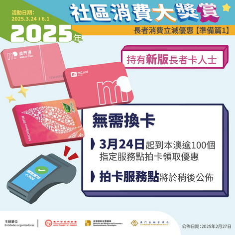 持有新版「長者卡」的居民,可於3月24日至6月1日活動期間,持卡前往全澳逾100個指定服務點,拍卡領取立減優惠。服務點詳情將於稍後公佈。