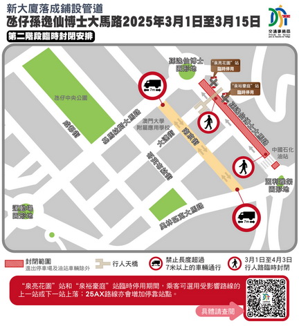 【本報消息】因應有新私人大廈落成須進行工程連接管道,氹仔孫逸仙博士大馬路一帶始實施臨時交通措施,交通事務局指其中封閉交通分兩階段進行;第一階段封閉交通配合工程進度提前一天完成,第二階段的封閉交通接續提前於3月1日至15日實施。