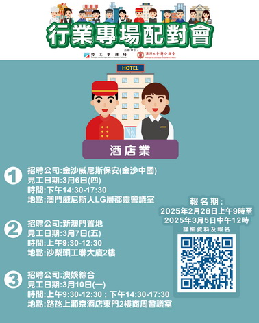3月6日下午舉辦酒店業「金沙威尼斯保安有限公司」專場配對會,提供35個職位空缺,涉及保安員等。3月7日上午舉辦酒店業「新澳門置地管理有限公司」專場配對會,提供17個職位空缺,涉及前堂值班經理、會計文員、倉務文員、工程師助理、物業管理巡樓員及公共地方服務員等。