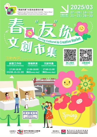 「春日『友』你文創市集」於3月7日至30日期間的周五、六、日下午五時至晚上九時舉行,屆時康公廟前地將化身文藝小天地,現場特設文創市集售賣手作好物,還有免費葡撻蠟燭工作坊及大型充氣花朵打卡裝置和快閃表演,在這個春天玩出「新花樣」。