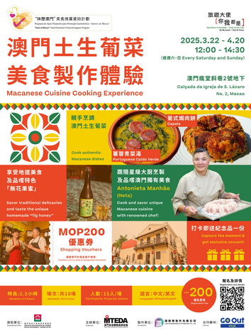 「澳門土生葡菜 美食製作體驗」由星級土生葡菜大廚Antonieta Manhão(Neta),於3月22日至4月20日期間的周六日親自帶領參加者深入探索土生葡菜的精髓,傳授經典菜式的烹調秘技,分享土生葡人小故事,讓居民和旅客感受澳門獨特的歷史與中葡美食文化交融的魅力。