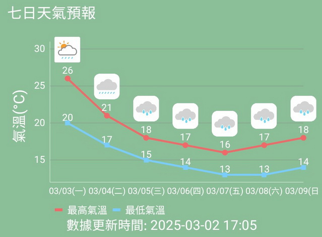 周四預料氣溫將進一步下降至14度至17度,繼續多雲和間中有雨,北風稍大,周五至周六最低氣溫將會下降至13度至17度,並維持多雲和有雨的天氣,下周日氣溫略為回升至14度至18度,大致多雲和有幾陣雨。