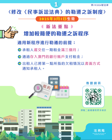 《修改〈民事訴訟法典〉的勒遷之訴制度》已於本月一日起生效,政府相信新制度可以令遇上「租霸」的出租人能夠循更有效和便捷的程序處理有關問題。「新勒遷制度」主要包括五個方面,一是針對長時間欠租的情況新設了程序更簡單快捷的勒遷之訴,只要滿足三個前提,包括租客遲交任一期租金滿三個月、租金是通過存入澳門的銀行賬戶支付,以及出租人已將欠租情況以書面方式通知租客,出租人便可向法院提起訴訟進行勒遷。