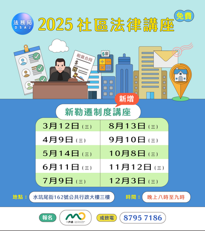 同時,法務局將每月舉辦「新勒遷制度」社區講座,講座將於公共行政大樓三樓舉行,有興趣市民可透過一戶通「活動報名」頁面或致電87957186報名參加,費用全免,先到先得,額滿即止,目前三月份的兩場講座已經滿額,最快可以報名參加四月份的講座。