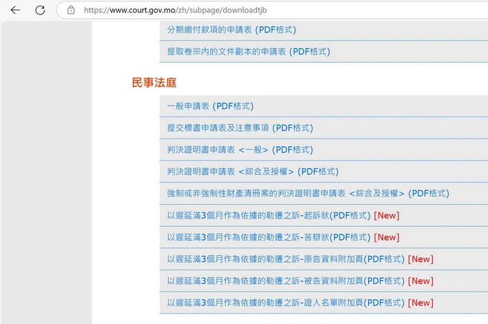 為方便有需要的市民,法院製作了相關的起訴狀、答辯狀及附加頁之表格,利害關係人可於法院網站「下載區/表格/初級法院/民事法庭」內下載,表格內附有相關注意事項。