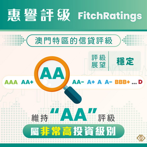 惠譽維持澳門特區屬於第三高級別的「AA」評級,主要是基於特區非常穩健的公共財政和對外收支狀況,以及特區政府縱使在經濟調整期仍堅守審慎的財政管理。與此同時,惠譽預期旅遊業和非博彩投資進一步增長,加上內地居民赴澳旅遊政策放寬及旅遊基建持續優化,將對澳門特區的經濟前景提供支持。