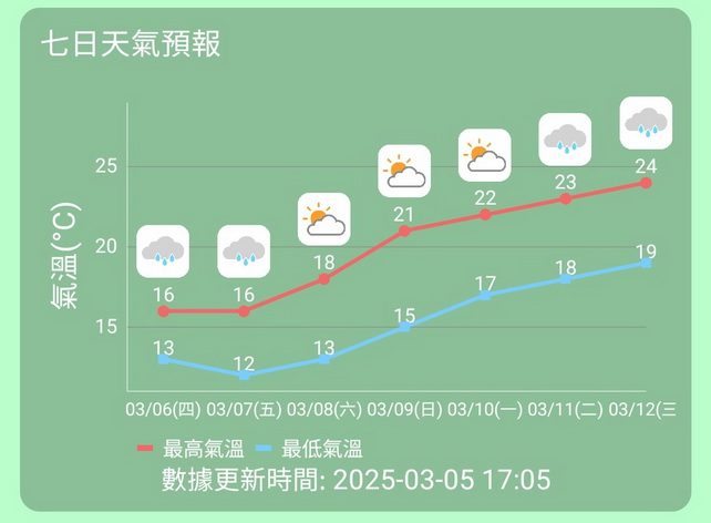 隨著這股冷空氣南下,氣象局進一步調低這波寒潮的最低溫預測,周五最低氣溫由此前的13度降至12度,最高氣溫維持約16度,仍然多雲及間中有雨,並有薄霧,相對濕度介乎80%至98%之間。預測周六起天色會有所好轉,有雨和有霧天氣會暫時停止,周末至下周初本澳將會維持多雲及短暫時間有陽光的天氣,氣溫會由周六的13度至18度,逐漸回升至下周一的17度至22度。不過,下周中起本澳又會再次出現雨霧天氣,太陽又會暫時休息,氣溫約為18度至24度,預測相對濕度最高可升至99%。