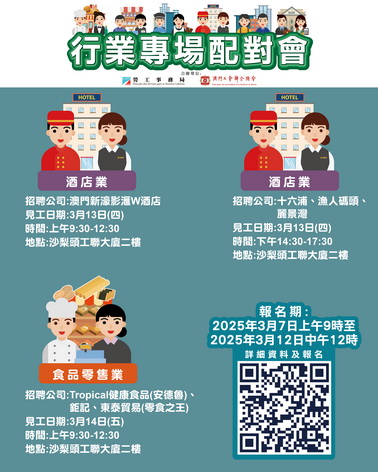 3月13日全日酒店業配對會及3月14日上午食品零售業配對會均在工會二樓(沙梨頭海邊街2-6號工聯大廈)舉行。報名日期為3月7日上午九時至12日中午12時。