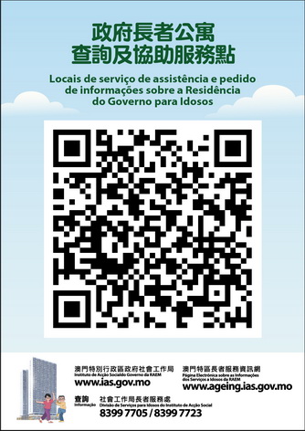 關政府長者公寓的詳情,可瀏覽社工網頁 www.ias.gov.mo 或澳門特區長者服務資訊網 www.ageing.ias.gov.mo。如有查詢,可透過電郵di@ias.gov.mo,或於辦公時間內致電8399 7705或8399 7723與社工局長者服務處聯絡,亦可親臨或致電向社工局或各協助申請的服務點查詢。