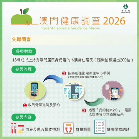 【本報消息】為貫徹落實《健康澳門藍圖》各項目標和指標,推動實現「幸福澳門」的願景,衛生局積極籌備「澳門健康調查2026」。是次先導調查得到居民的支持及參與,被抽中的200個對象名額已順利完成預約安排。