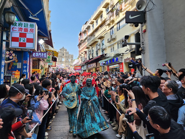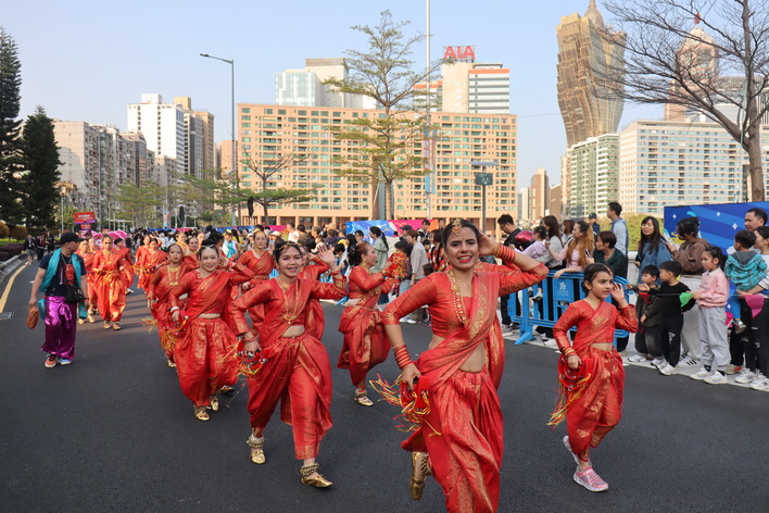 【本報消息】由文化局聯同六大綜合旅遊休閒企業合辦的慶祝澳門回歸祖國26周年「2025澳門國際幻彩大巡遊」周日下午在大三巴牌坊起步,由大約1,800名參演人員組成的隊伍秉承宣揚「愛‧和平‧文化共融」的理念巡遊到西灣湖廣場;傍晚隨即舉行2025年「東亞文化之都‧中國澳門」活動年開幕儀式,以文化共融的匯演形式為活動年揭開序幕。