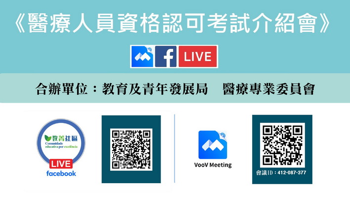 有意參加分享會的學生,可由即日起登入教青局駿菁活動中心網頁(www.dsedj.gov.mo/~webdsej/www_cj/index-cabh.php)進行網上報名,藉此向醫療專業委員會了解醫療人員資格認可考試的相關情況。分享會亦設線上直播,歡迎本澳以外地區升學的同學透過掃瞄二維碼收看。如有查詢,可於辦公時間致電8490 3686,或電郵至cabh@dsedj.gov.mo。