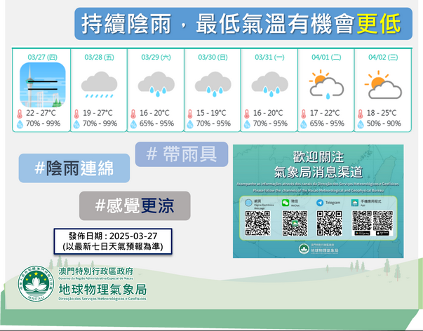 氣象局又預料周末期間受東北季風影響,預料華南地區由29日起氣溫將顯著下降,24小時內的降溫幅度可達10度。預料本澳周末至下周初的最低氣溫將下降至15度左右;然而,由於現時不同預報模式對冷空氣的強度預測仍存分歧,且持續受多雲有雨天氣影響,因此最低氣溫可能略低於現時的預測。
