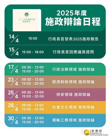 至於各領域施政方針的立法會辯論會議,日程分別是:4月17日辯論行政法務領域、23日辯論經濟財政領域、25日辯論保安領域、28日辯論社會文化領域,以及30日辯論運輸工務領域施政方針。