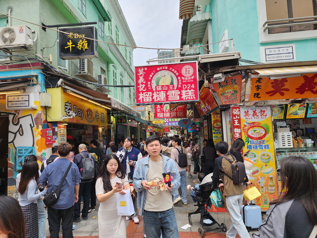 氹仔舊城區連續三日的旅客人流都熱旺,周日現場多間牛雜小食店和葡撻店繼續排長龍,有小食店店員表示,近兩年區內同類型的牛雜小食店數量增加,但排隊情況最厲害的依然是位於官也街內的店面,不過旅客大都是買一盤牛雜後多人分享,旅客掃街寧願買少量淺淺品嚐,再多吃幾款食品,在此消費模式下,每單銷費額自然下降,因此人流對生意有幫助,今個清明節假期人流明顯較平日周末假期多,而四月中的復活節假期港客料會增多,期望屆時生意也會較平日周末假期好。
