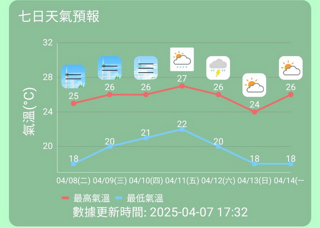 不過當局預料潮濕及狂風暴雨天氣僅在周六維持六,下周日氣溫略降,天色漸轉明朗,約為18度至24度,吹三至四級北至東北風,間中五級及有陣風,屆時相對濕度會快速降至40%至75%。展望下周一氣溫約為18度至26度,天色較為明朗,日間天氣乾燥。