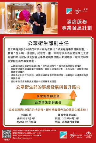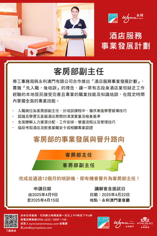 如有查詢,可於辦公時間內致電勞工局就業廳何小姐(電話:8399 9821)或永利招聘熱線朱小姐(電話:8986 6222)。