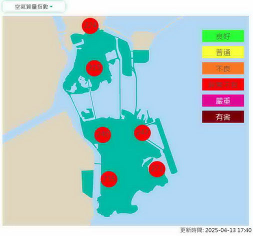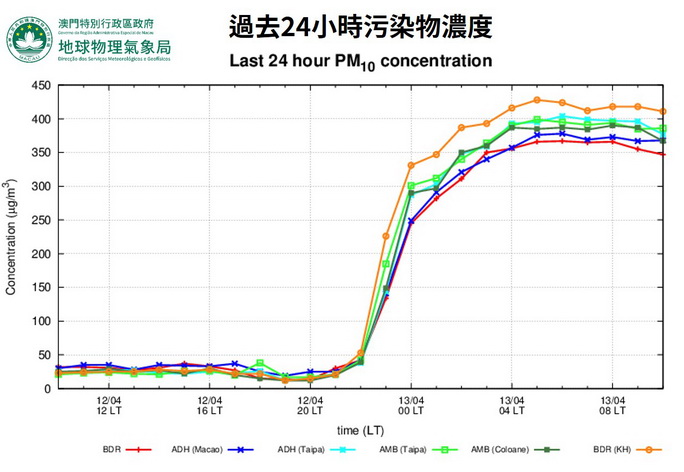 氣象局表示,受沙塵天氣影響,本澳周日大氣污染物濃度顯著上升。根據該局空氣質量監測資料顯示,截至4月13日10時,多個監測站點的可吸入懸浮粒子PM10小時濃度達到350微克/立方米以上(最高小時濃度428微克/立方米,於九澳路邊站4月13日五時錄得),預料全日PM10濃度會維持高水平,空氣質量指數可能達「非常不良至嚴重」水平。是次沙塵天氣主要是由於北方近地面強風捲起沙塵,並隨東北季風傳輸南下至華南地區和珠江口地區引致。