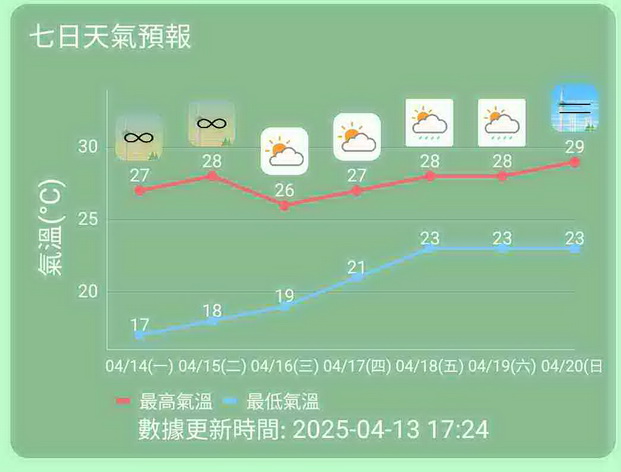 另外,根據氣象局末來一周天氣預測,剛過去的周日受非常乾燥的大陸氣流及沙塵天氣影響,加上風勢微弱,未來一兩日廣東地區能見度較低,日夜溫差頗大。預料一股偏南氣流會在本周中後期逐漸影響本澳,並帶來較為潮濕天氣。而一道低壓槽會在本周後期至下周初帶來幾陣驟雨天氣。