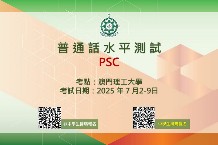 【本報消息】由澳門理工大學語言及翻譯學院與國家語言文字工作委員會普通話與文字應用培訓測試中心合辦,澳門地區普通話水平測試(PSC)將於今年7月2日至9日在理大舉行,現正接受報名。