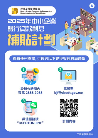 有需要的商業企業主可透過經科局網頁瞭解計劃詳情。如有任何查詢可於辦公時間內致電2888 2088、電郵至bjf@dsedt.gov.mo或透過微信服務號「DSEDTONLINE」與經科局聯繫。