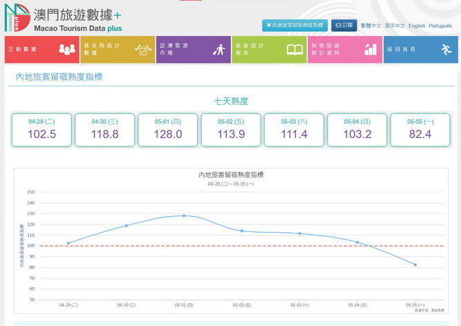 旅遊局也與內地大型線上旅遊平台攜程合作由周一起逢星期一在局方的「澳門旅遊數據+」平台發佈未來一周的內地旅客來澳留宿熱度指標,協助旅遊及酒店業界更好掌握相關趨勢。網站顯示有關數據是攜程平台根據其用戶對澳門目的地的預訂量,及網頁搜索量,近期趨勢變化等重點指標,擬合澳門目的地出行(留宿)人次預測,計算內地旅客到澳門留宿的熱度指數。周一下午平台數據顯示,近一周內地旅客留宿澳門會於周四五一勞動節當日達到最高,隨後逐漸下行。