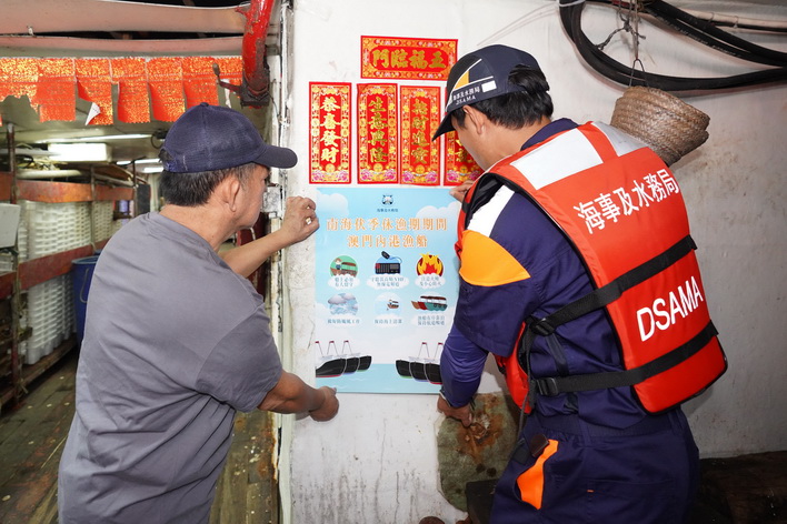 【本報消息】為期三個半月的南海休漁期將由5月1日中午開始至今年8月16日中午結束。隨著內港一帶錨泊的漁船數量增加,海事及水務局聯同警察總局、海關、消防局、市政署、衛生局以及漁民團體代表登船拜訪漁民,宣導休漁期期間防火、防風、防污、防盜和衛生等意識,呼籲漁民業界遵規守法,共同維護海上安全環境。