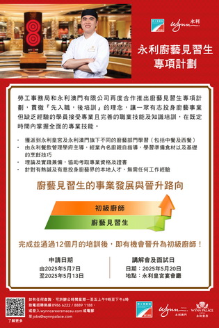 【本報消息】為培育本地人才,提供職業發展機會,勞工事務局和永利合作推出「永利廚藝見習生專項計劃」,以「先入職、後培訓」方式,為有志投身綜合休閒旅遊服務行業的澳門居民提供一系列的專業培訓及工作實踐,計劃由5月7日起接受申請。