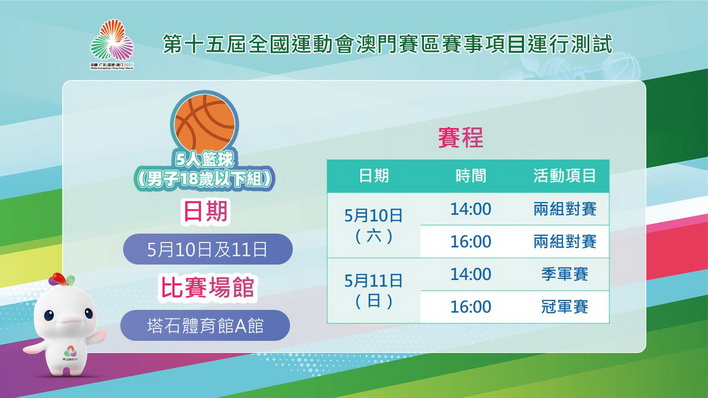 為了對賽事運行的各個環節進行檢視和優化,15運會及殘特奧會澳門賽區籌備辦公室將在五月及六月舉行15運會五個比賽的項目運行測試,當中,五人籃球(男子18歲以下組)將率先於本周末(5月10及11日)下午兩時在塔石體育館A館舉行,來自澳門、珠海、中山、江門的球隊將抽籤分成兩組對賽,賽事將開放予市民及旅客入場觀賞,提前感受全運會盛事的氣氛。