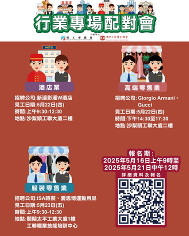 5月22日上午酒店業專場配對會及同日下午零售業專場配對會在工聯二樓舉行;5月23日上午零售業專場配對會在工聯職業技能培訓中心舉行。報名日期由5月16日上午九時至21日中午12時。