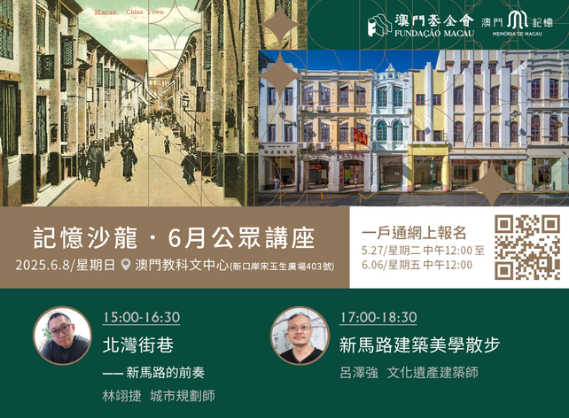 首兩場「記憶沙龍」公眾講座將於6月8日下午於澳門教科文中心舉行,分別由城市規劃師林翊捷於三時至四時半主講「北灣街巷─新馬路的前奏」,以及文化遺產建築師呂澤強於五時至六時半主講「新馬路建築美學散步」,帶領市民細味新馬路的前世今生,感受澳門城市發展與文化保育的深層魅力。