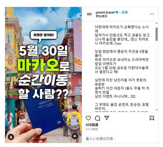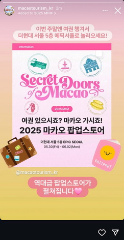 THE現代首爾是首爾最大型購物中心,曾是人氣韓劇的取景地及知名歌手的媒體展覽場地。旅遊局將一連四天帶來「澳門秘密之門」快閃店,延續去年在韓國的宣傳主題「My Favorite Macao」,並以「浪漫」為切入點,設計互動遊戲、打卡裝置和精彩演出等,讓韓國居民和旅客探索澳門五大浪漫旅遊體驗。