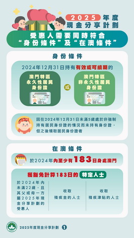 2025年度現金分享計劃除維持要求於2024年12月31日持有澳門居民身份證外,並要求同時符合於去年全年身處澳門至少183日的要求,但為照顧特定群體,有三類人士即使不符合在澳條件,亦可豁免計算在澳時間,包括去年未滿22歲且父母一方具備領取資格的居民、收取殘疾金或殘疾津貼的居民。