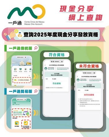 居民即日起可登入「一戶通」或現金分享計劃網頁(www.planocp.gov.mo/)查詢是否符合發放資格。符合發放資格的人士會按照既定的時間表,透過銀行轉帳或支票方式自動收取款項,無需提出申請。