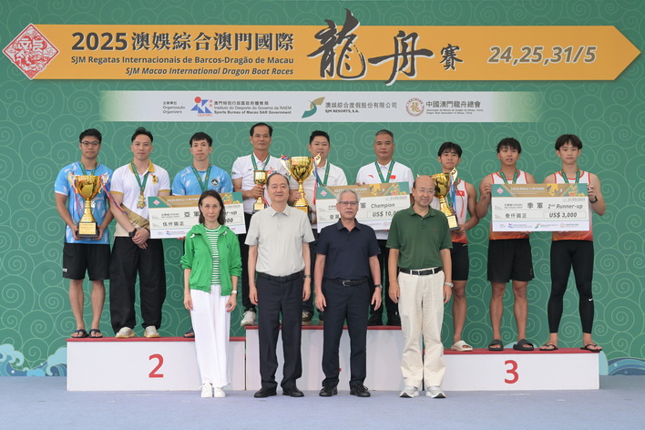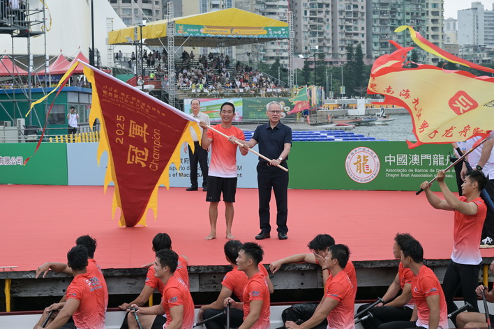 【本報消息】由體育局、澳娛綜合及中國澳門龍舟總會主辦,市政署及行政公職局協辦的「2025澳娛綜合澳門國際龍舟賽」,端午節正日於南灣湖水上活動中心進行壓軸的賽事。最終中國南海九江再度衛冕澳門國際龍舟邀請賽標準龍公開組(500米)及女子組(500米)冠軍,並刷新兩組賽事紀錄;大學生邀請賽標準龍公開組(500米)由泰國國家體育大學奪得。行政長官岑浩輝出席活動觀賞龍舟賽事,並主持點睛儀式及頒獎。