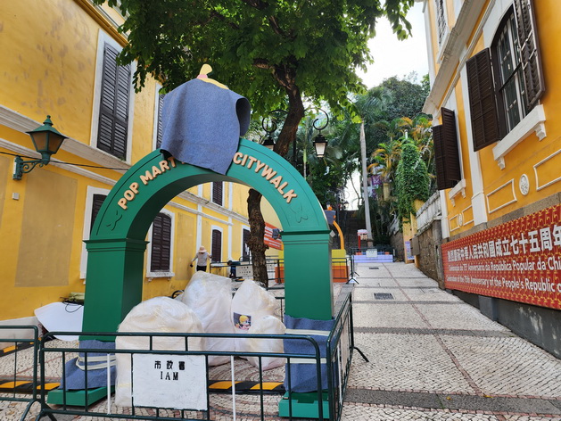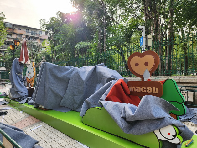 周一現場所見四個地點正進行搭建工程,其中三個人氣角色已到達活動場地「候場」,工作人員並正搭建諮詢站、禮品兌換和其他設備,其中設在氹仔排角路的LABUBU裝置不時吸引途經的旅客影相。