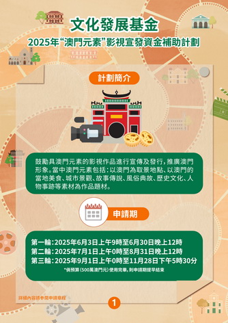 2025年「澳門元素」影視宣發資金補助計劃共設三輪申請期,第一輪申請期由6月3日至30日;第二輪由7月1日至8月31日;第三輪由9月1日至11月28日。資助計劃支持含澳門元素且已完成攝製、可供放映的影視作品,並透過影展參展或公開播映等方式進行宣傳發行。