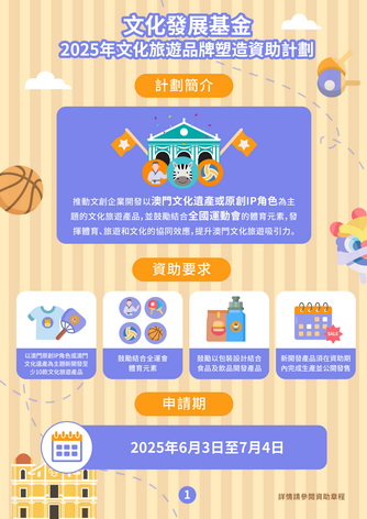 2025年「文化旅遊品牌塑造資助計劃」申請期由6月3日至7月4日,支持文創企業開發以澳門文化遺產或原創IP角色為主題的文化旅遊產品,並鼓勵結合全國運動會的體育元素,發揮體育、旅遊和文化的協同效應。資助計劃為補貼形式,上限為項目預算支出的40%至50%,最高50萬元,名額最多10個,資助期24個月。