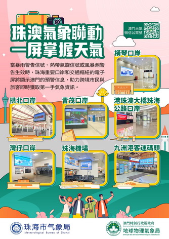 【本報消息】為促進橫琴粵澳深度合作區的氣象服務,本澳氣象局與珠海市氣象局聯合推出「珠澳氣象預警」專頁,同時當澳門暴雨警告信號、熱帶氣旋信號或風暴潮警告生效時,珠海市七個重要口岸和交通樞紐共15處電子屏將顯示澳門預警信息,以期進一步便利跨境市民和旅客瞭解珠澳兩地的氣象預警資訊,從而更好地規劃行程及做好應對措施。