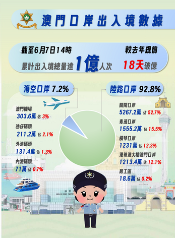 此外,關閘口岸已於5月30日率先突破5,000萬人次通關;橫琴口岸及港珠澳大橋澳門口岸亦於5月7日及9日先後錄得年度1,000萬人次通關,較往年提前達成。