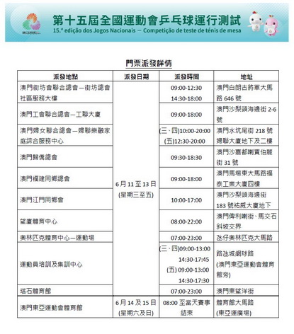 乒乓球項目運行測試將於6月14日及6月15日連續兩天舉行,賽事於每日上午九時開始,持票人士可在比賽開始前一小時入場。為方便市民和旅客領取門票,有興趣人士可於6月11日至13日在指定地點的開放時間內領取免費門票,每人每次限取兩張門票,或在比賽日上午八時起至當天賽事結束,在澳門東亞運動會體育館現場領票處取票進場,項目運行測試門票均不設劃位,派完即止。入場時請注意門票條款,並按工作人員指引有序進場。