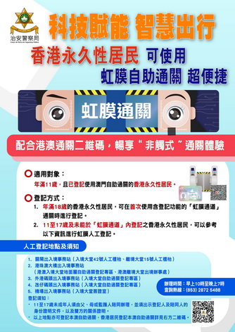 根據登記及使用虹膜通關安排,年滿11歲且已登記本澳自助過關的香港永久性居民可透過指定方式進行虹膜登記,當中年滿18歲的通關人士,可在首次使用含登記功能的「虹膜通道」通關時進行登記,一般需時25秒。