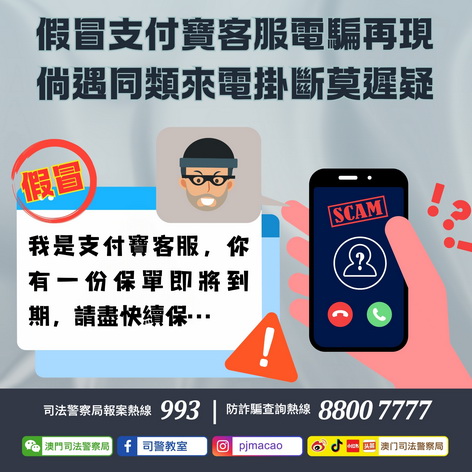 【本報消息】司法警察局早前於四月底及五月中旬分別採取行動搗破兩個在本澳的假冒支付寶客服電話詐騙窩點後,直至近日局方再次接獲多名市民檢舉及提供資料指收到同類型詐騙電話。