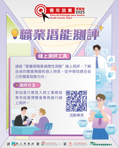 有意參與測評的青年,可登入勞工局青年就業博覽會專頁(www.dsal.gov.mo/zh_tw/standard/youthcareerexpo2025.html)進行線上測評。如需查詢,可於辦公時間致電2882 2891,與新青協李小姐或馬小姐聯絡。