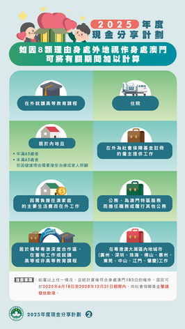根據《2025年度現金分享計劃》行政法規,因下列八類理由,包括就讀當地認可的高等教育課程;住院;年滿65歲居於內地,或者未滿65歲因健康原因而居於內地;在外地為已在社會保障基金登記的僱主工作;為負擔居於澳門的家庭成員主要生活費而在外地工作;履行公務;居於橫琴粵澳深度合作區、在當地工作或就讀當地認可的高等或非高等教育課程;在粵港澳大灣區內地城市工作。則可視為身處澳門,並可申請將有關期間計入在澳期間,如經計算後符合在澳183日的標準,則可獲發款項:居民如有查詢,可致電查詢熱線2822 5000。