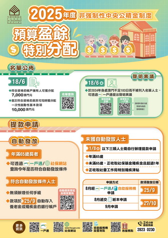 【本報消息】社會保障基金18日公佈非強制性中央公積金制度2025年度預算盈餘特別分配款項名單,居民由早上九時起可透過一戶通、社保基金網站www.fss.gov.mo、自助服務機或24小時語音熱線28230230等進行查詢。聲明異議及提款申請可透過一戶通提出,同時一戶通及社保基金網站亦可查詢自動提款登記狀況及是否符合自動發放條件。