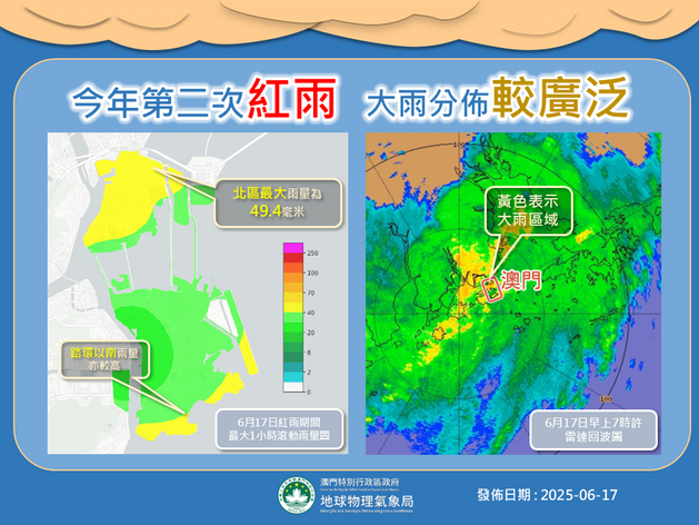 氣象局表示,受高空擾動及西南氣流影響,珠江口以西於17日凌晨開始持續受到強雷雨區影響,其中強降雨普遍影響本澳各區,澳門半島及路環以南雨勢最大。早上六時左右本澳以西地區開始出現另一波強雨區發展,由於預測該強雨區將影響本澳,氣象局遂發出特別天氣信息提醒,並於早上6時20分發出黃色暴雨警告信號,及後又在6時35分發出今年第二個紅色暴雨警告信號。期間大雨普遍影響澳門各區,當中以澳門半島及路環以南雨勢最為明顯,多個站點錄得最大一小時滾動累積雨量接近50毫米,其中澳門污水處理廠站更錄得最高的49.4毫米。